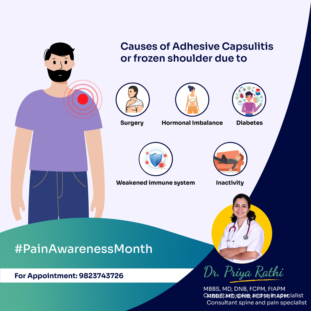 Frozen shoulder, also called adhesive capsulitis, involves stiffness and pain in the shoulder joint. Signs and symptoms typically begin slowly, then get worse. Over time, symptoms get better with pain management treatment. Frozen shoulder typically develops slowly in three stages.-Freezing stages. Any movement of the shoulder causes pain, and the shoulder's ability to move becomes limited causing limitations of daily routine activities like wearing clothes, combing hair etc. This stage lasts from 2 to 9 months.-Frozen stage. Pain might lessen during this stage. However, the shoulder becomes stiffer. Using it becomes more difficult. This stage lasts from 4 to 12 months.-Thawing stage. The shoulder's ability to move begins to improve. This stage lasts from 5 to 24 months. Know how pain management can help get rid of frozen shoulder.